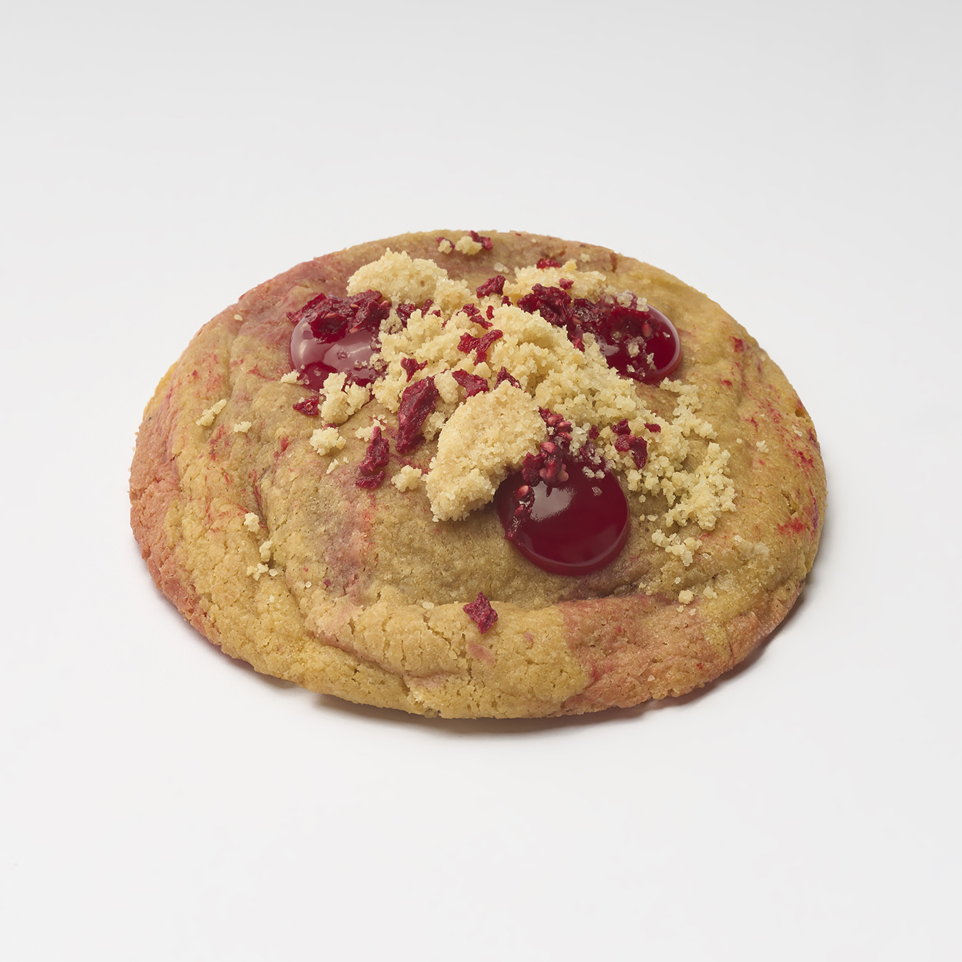 INGREDIENTES: Harina de arroz, harina de garbanzo, almidón de tapioca, almidón de maíz, sal, impulsor, azúcar moreno, azúcar blanco, margarina, huevo, queso crema, azúcar glas, pasta de fresa, fresa liofilizada, mermelada de fresa y crumble.